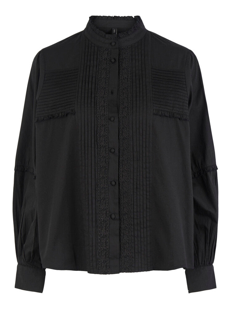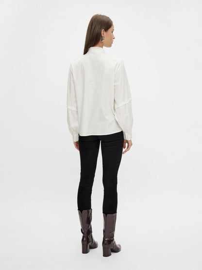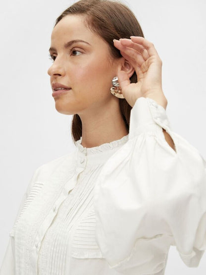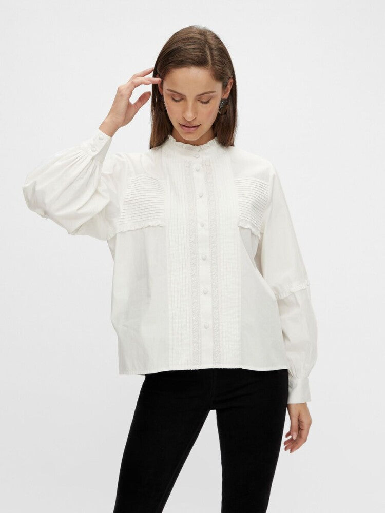 Lekker skjorte med plisserte detaljer og halvpolo-hals med rysjedetaljer. Skjorta har ballongermer og rysjepaneler i hoveddelen og ermene. Lukkast med knepping framme.