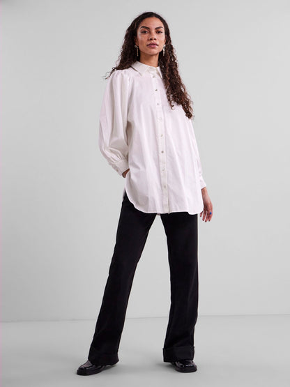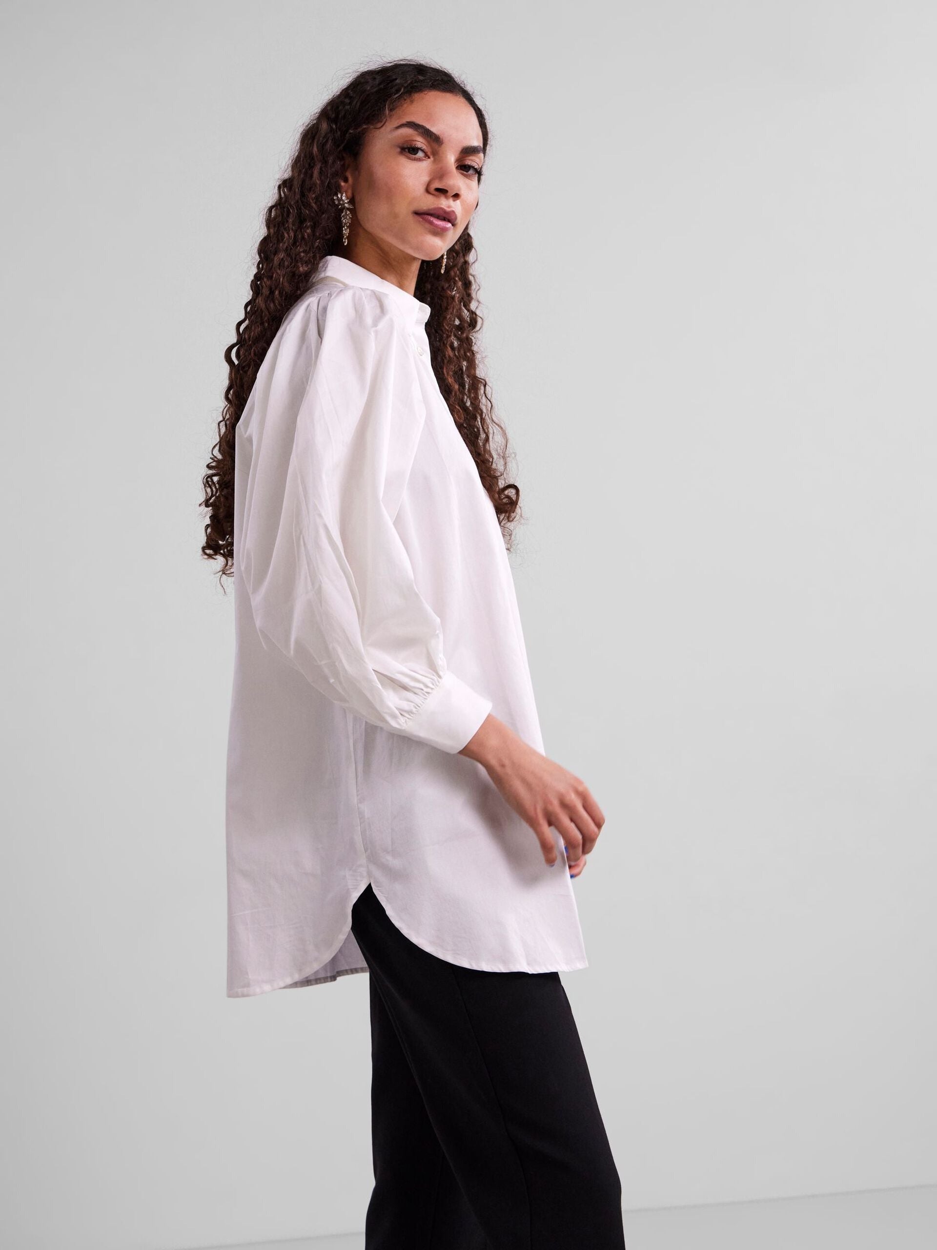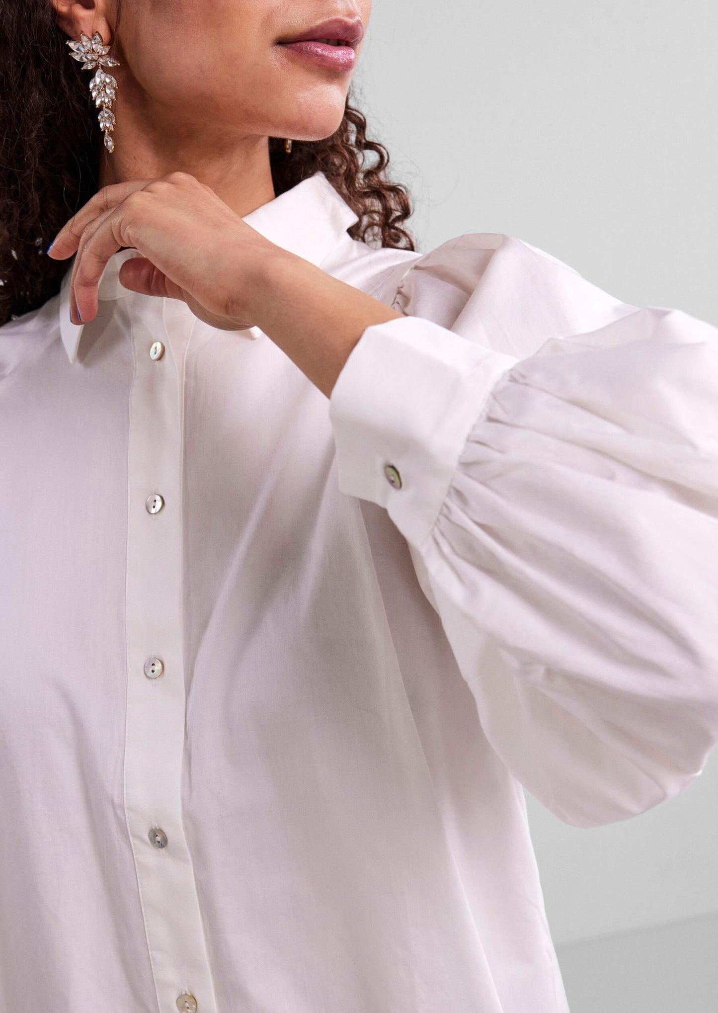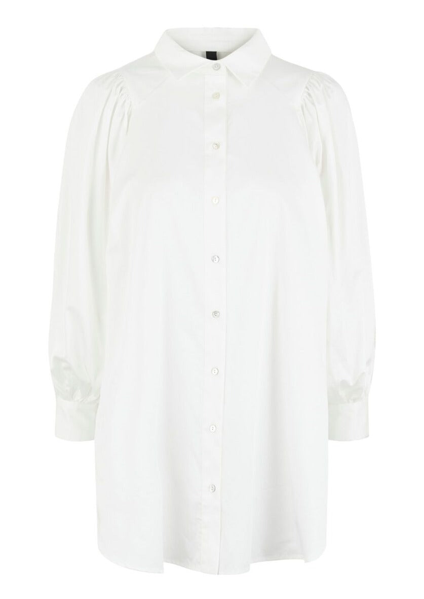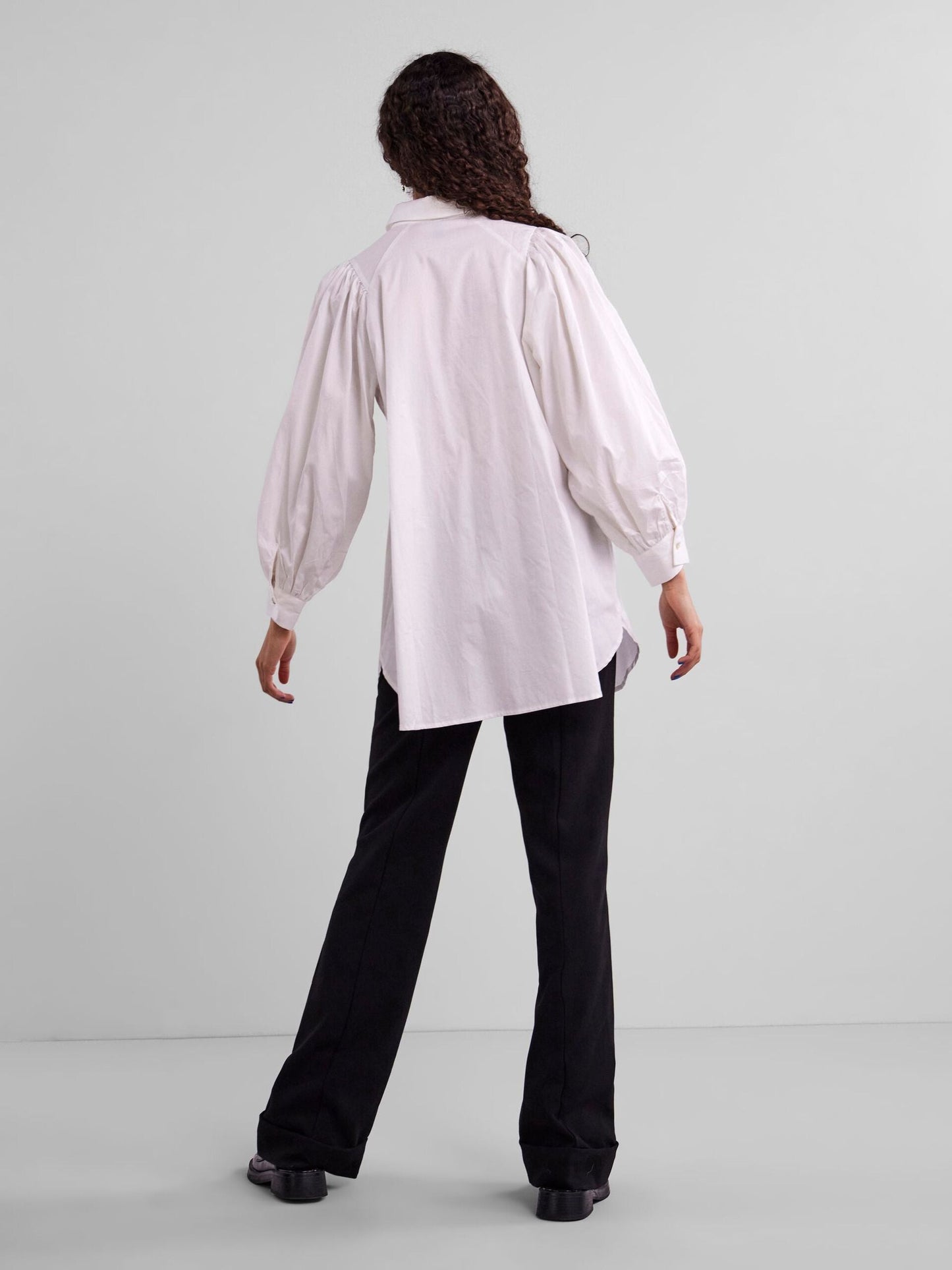 Superstilig lang hvit skjorte. Skjorten har ballongermer, perleskimrende knapper og en oversized passform.