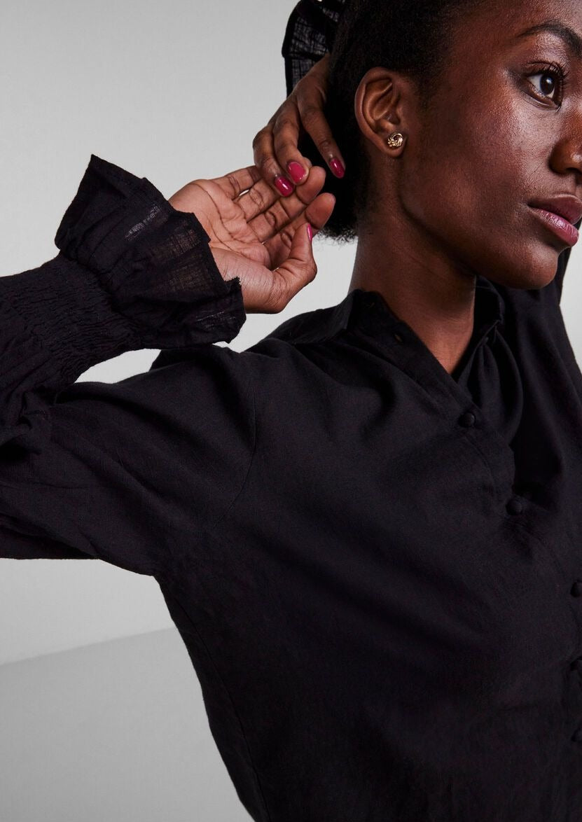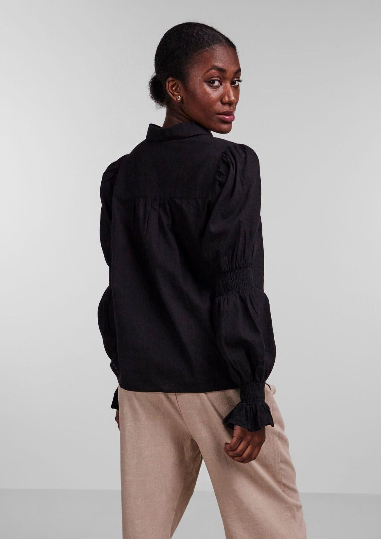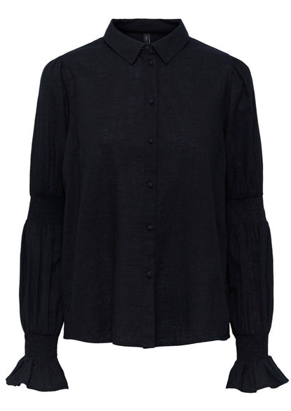 Stilig skjorte med knepping foran. Den har stilige samlede detaljer på skuldrene og lange virago-ermer. Den er normal i størrelsen.